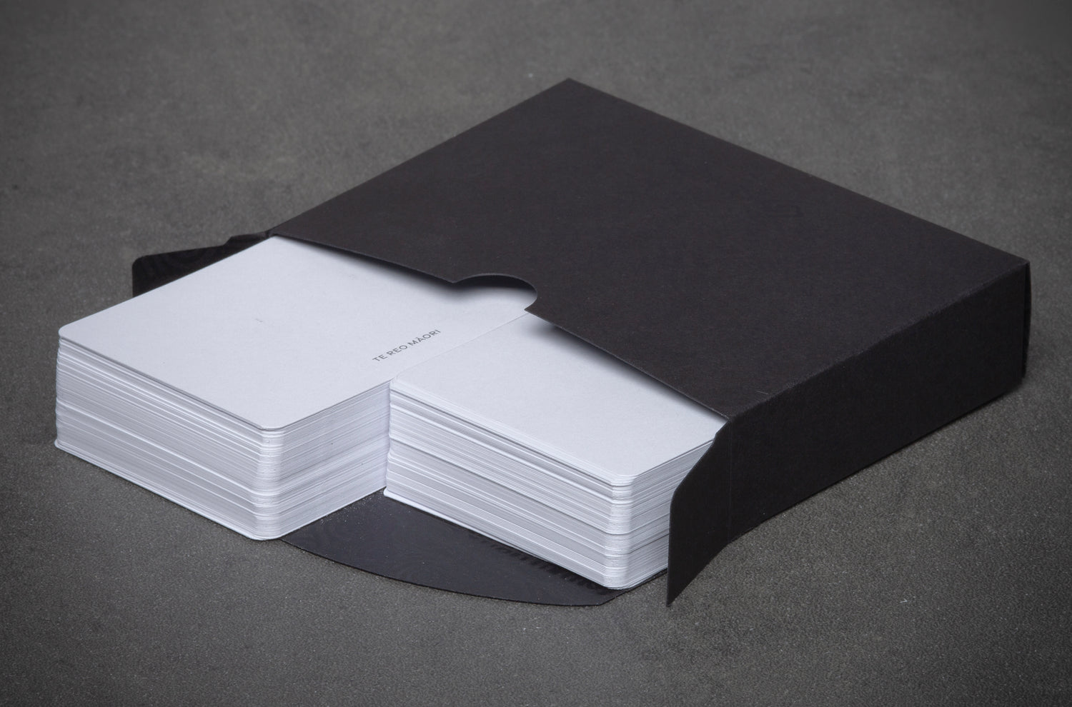 Printed in Wellington on a smooth 300gsm matt stock, each card is die-cut to a round-cornered rectangle. The cards come packed into a reusable carton, which is printed with subtle black-on-black Seneca branding on a 320gsm black stock.
